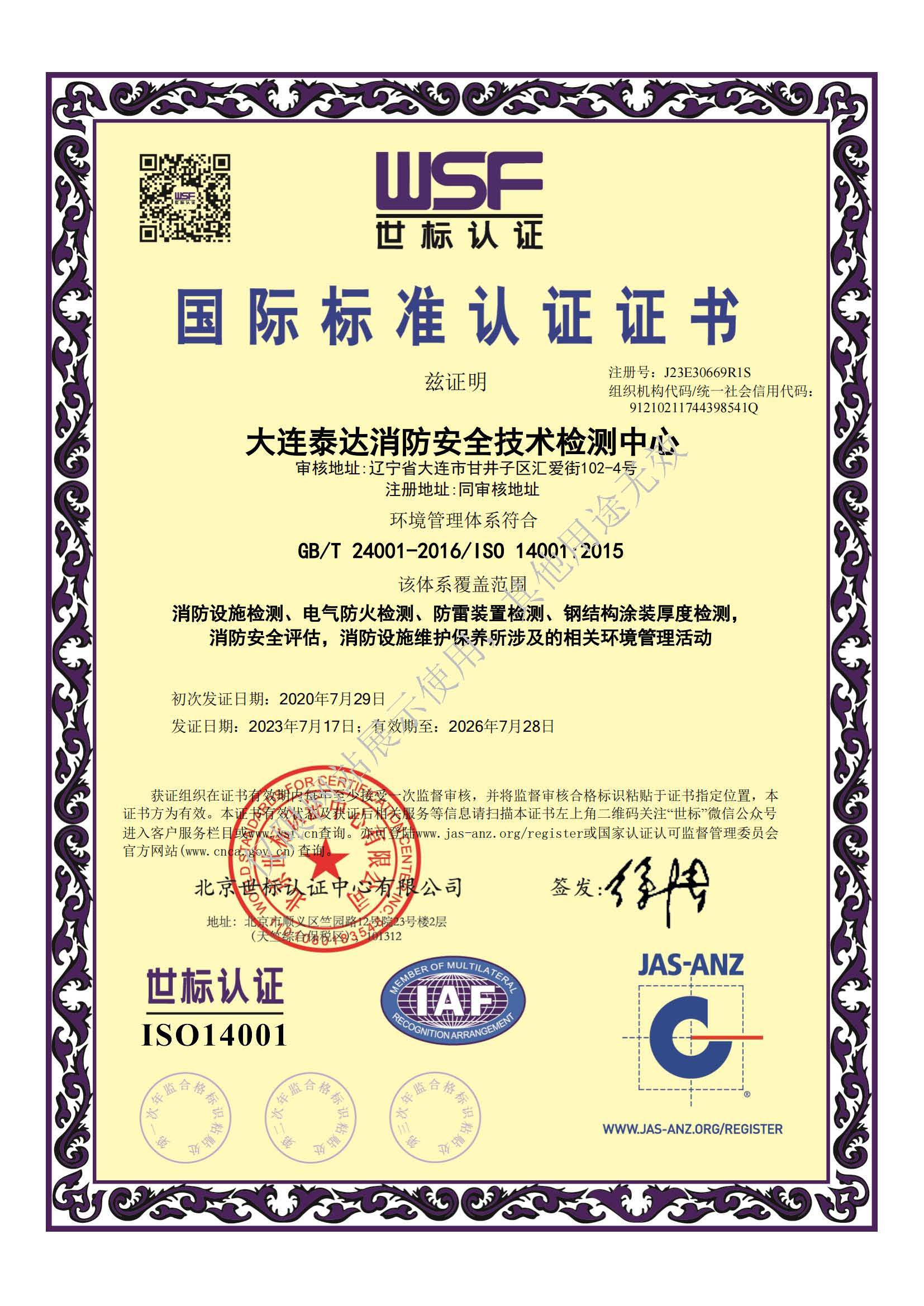 · 是經“社會消防技術服務信息系統”備案并公示的消防技術服務機構,已取得中國氣象局頒發(fā)的雷電防護裝置檢測資質證書、遼寧省質量技術監(jiān)督局審核批準的檢驗檢測機構資質認定證書(CMA)及包括消防檢測、電氣檢測、雷電防護裝置檢測、防火涂層厚度檢測等在內的200余項檢驗檢測能力,取得大連市應急管理局頒發(fā)的安全生產標準化證書,獲得質量管理體系、環(huán)境管理體系、職業(yè)健康安全管理體系認證證書,是經備案的高新技術企業(yè),可獨立出具具有證明作用的檢測報告。
